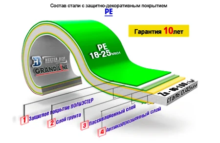 Кровельный материал в покрытии «PE 0.45» на основе глянцевого полиэстра — это бюджетный вариант. Чаще всего его используют в качестве кровли дачных домов и жилых деревенских домов. Производится металугическими заводоми в России (НЛМК, ММК, Северсталь, Кошира)