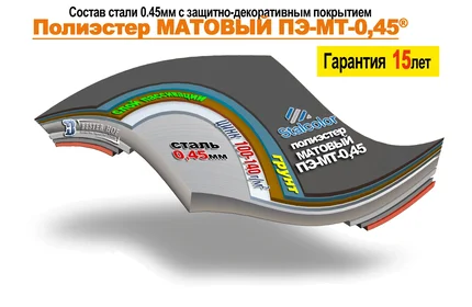 Сталь имеет толщину 0,45 мм (ПЛЮС ПОКРЫТИЕ!) и сбалансированный защитный металлический слой цинка 100-140г/м2. Обратная сторона листа с эпоксидной грунтовкой. Гарантия 12лет. / срок службы от 25лет.